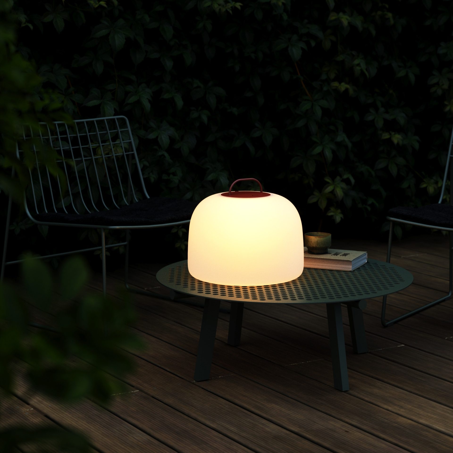 Ogrodowa lampa stołowa Kettle wykonana została z odpornego na warunki atmosferyczne tworzywa sztucznego oraz posiada podwyższone parametry szczelności, dlatego możesz ją zostawić na zewnątrz nawet podczas deszczu. Wielofunkcyjna lampka stołowa Kettle do ogrodu wyposażona jest w biały półokrągły klosz oraz wspomniany już praktyczny uchwyt – dzięki niemu w każdej chwili możesz ją przenieść w zupełnie inne miejsce.