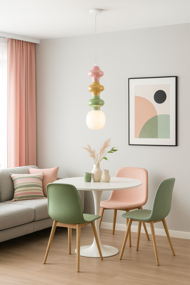 Wielokolorowa lampa wisząca Vilrosa C na metalowym stelażu wyposażona jest w designerski klosz w czterech pastelowych kolorach: różowym, beżowym, zielonym i białym. Kolorystyka oferowanej lampy z metalowym stelażem, w połączeniu z nietypową formą, wnosi do wnętrza świeżość i przyciąga wzrok. To propozycja, która stać się może jednym z bardziej dekoracyjnych elementów Twojej aranżacji!