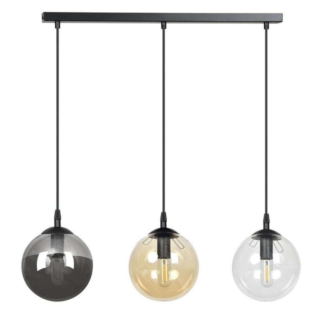 Designerska lampa wisząca Blair 3 to nowoczesna, prosta w formie konstrukcja, która zachwyca nietypowym odcieniem kloszy. Każdy z nich wykonany został ze szkła o innym kolorze: grafitowym, miodowym i transparentnym. Klosze zawieszone są na przewodach zasilających, prowadzących do metalowej podsufitki. Cały stelaż utrzymany jest w czarnej kolorystyce, która przepięknie podkreśla różnokolorowe szkło. Jednym z najbardziej dekoracyjnych detali jest również połyskujące wykończenie kloszy. Każdy z nich przepięknie odbija światło.