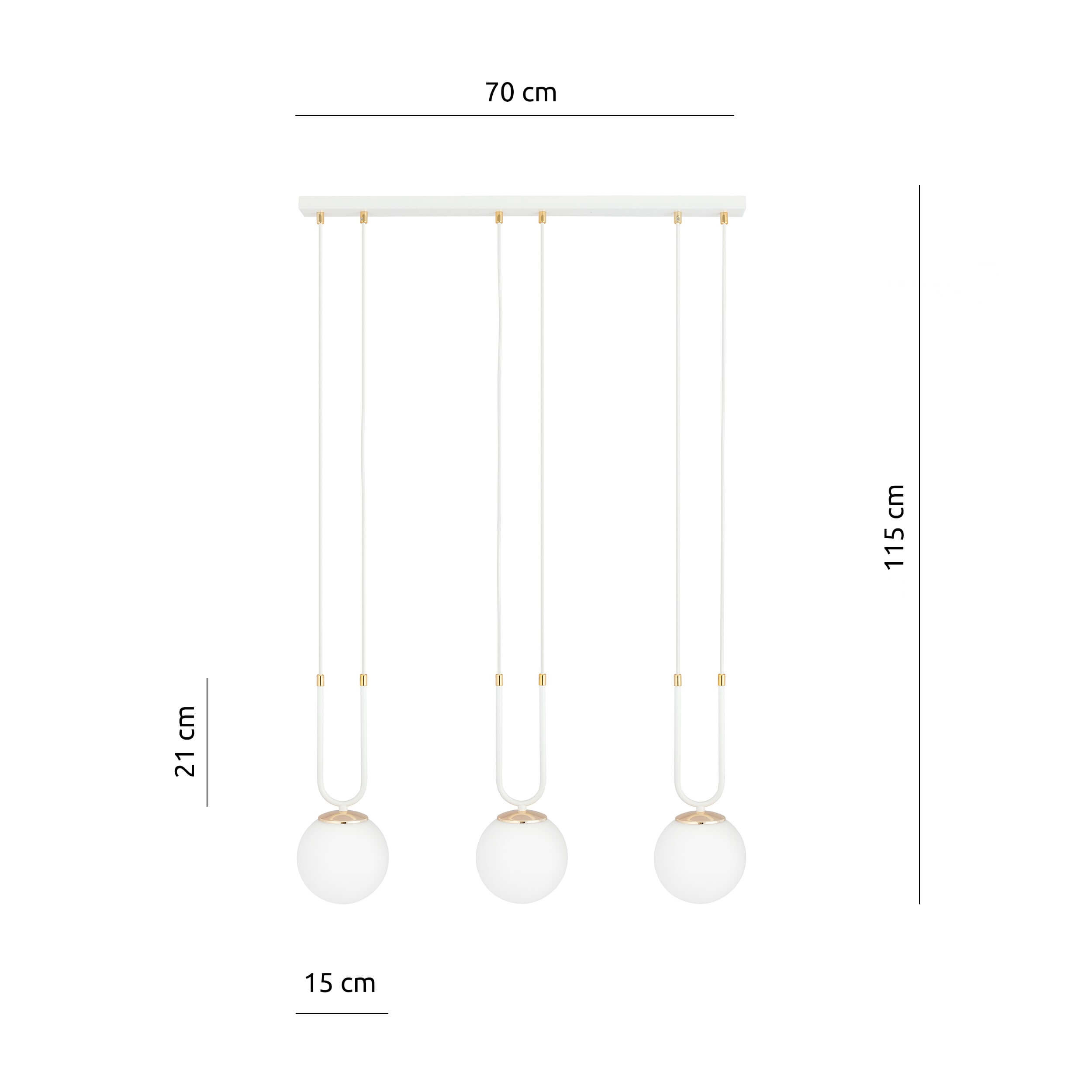 Model jest szeroki na 70 cm i wyposażony w kuliste klosze o średnicy 15 cm (każdy). Wszystkie kule wykonane są ze szkła w białym kolorze, dzięki czemu lampa wisząca do kuchni i jadalni Marga 3 doskonale rozprasza światło po całym pomieszczeniu. Klosze przystosowane są do żarówek w klasie energetycznej od A++ do E, a także do oświetlenia LED, wyróżniającego się mniejszym zużyciem energii elektrycznej. Do domowego użytku polecamy światło o ciepłej lub neutralnej barwie.