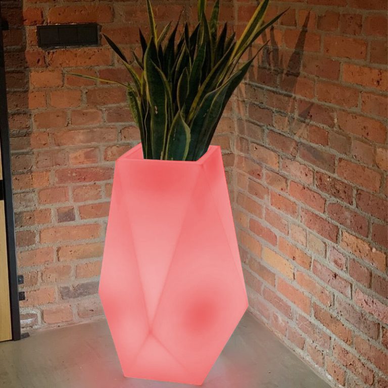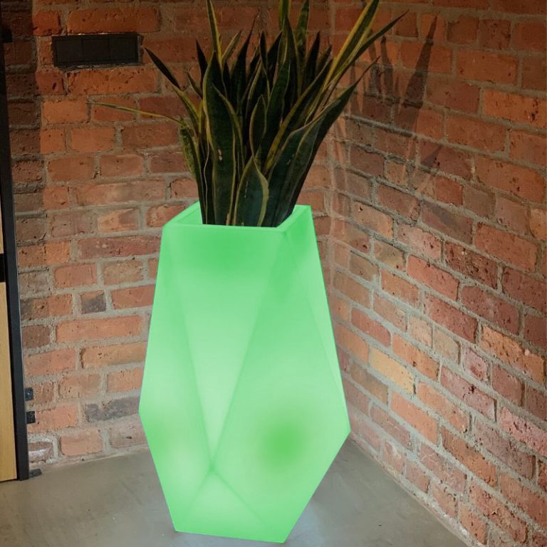 Wysoka donica Volcano posiada geometryczne, ostre linie, poprzez które doskonale wpasuje się w nowoczesne, stylowe wnętrza. Swoim designerskim wyglądem donica Volcano przypadnie do gustu niejednej osobie. Podświetlana donica stworzy przyjemny klimat w każdym domu, na tarasie, czy w ogrodzie pełniąc jednocześnie funkcję oświetlenia ogrodowego.