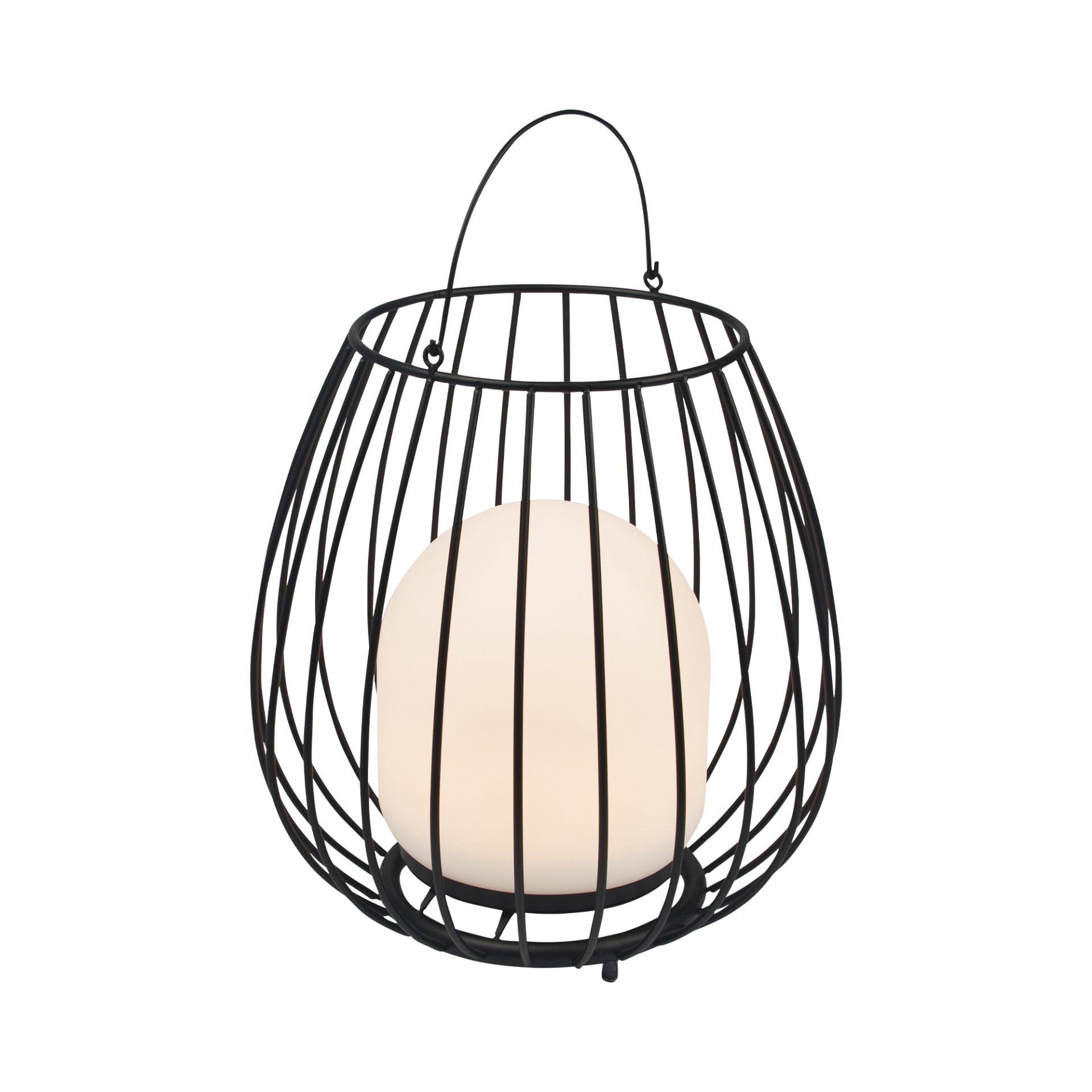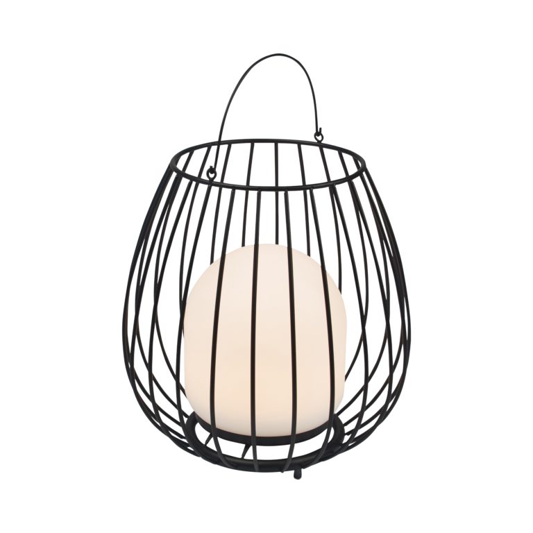 Oferowana lampa do ogrodu wyposażona jest w biały zaokrąglony klosz wykonany z tworzywa sztucznego w metalowej czarnej oprawie o ażurowej strukturze. Całość ma wysokość 38,4 cm oraz szerokość i głębokość 28 cm. Optymalne rozmiary zewnętrznej lampy stołowej Jim w czarnym kolorze pozwolą Ci postawić ją praktycznie wszędzie – nawet na niewielkim balkonie! Model wyposażony jest również w przewód o długości 100 cm.