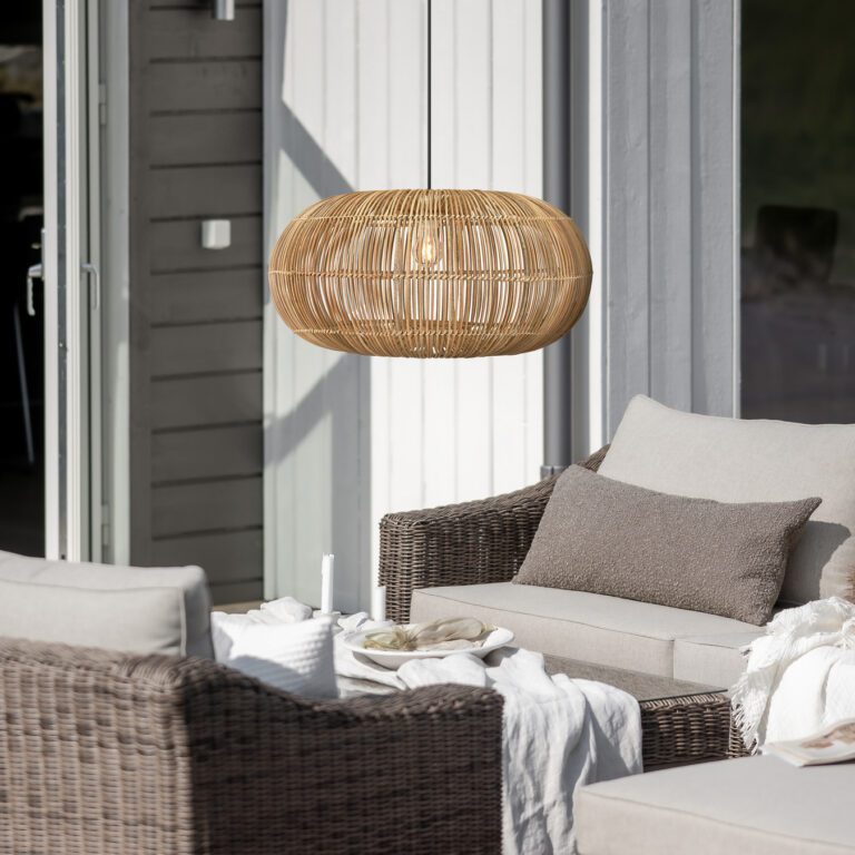 Designerski wygląd to jedna z najważniejszych cech zewnętrznej lampy wiszącej z rattanowym abażurem Zuri. Oferowany model będzie unikatową dekoracją, która ozdobi Twój taras lub inne miejsce w okolicy Twojego domu. Lampa zewnętrzna Zuri doskonale prezentuje się zarówno wieczorem, gdy zapalisz światło, jak i w ciągu dnia zdobiąc przestrzeń unikatową formą.