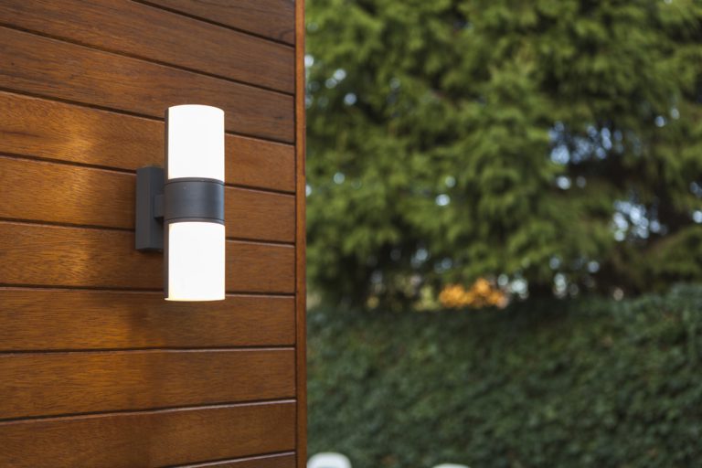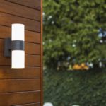 Zewnętrzny kinkiet ścienny Cyra na szarym stelażu