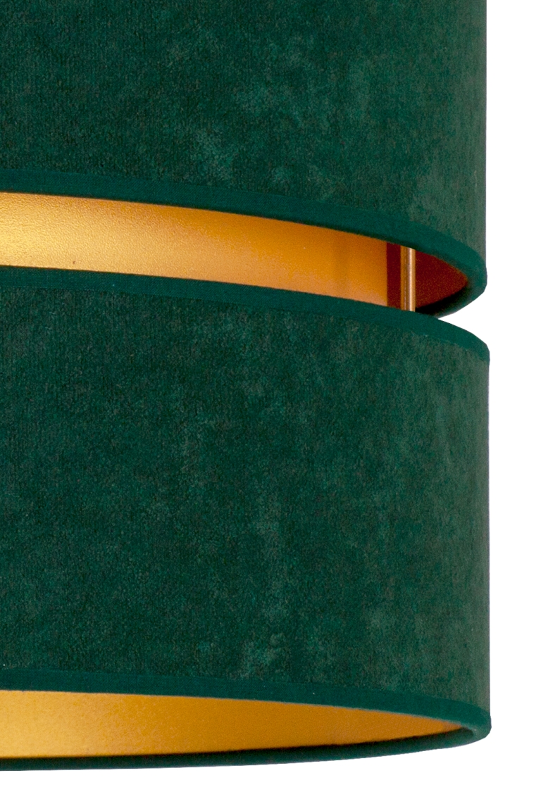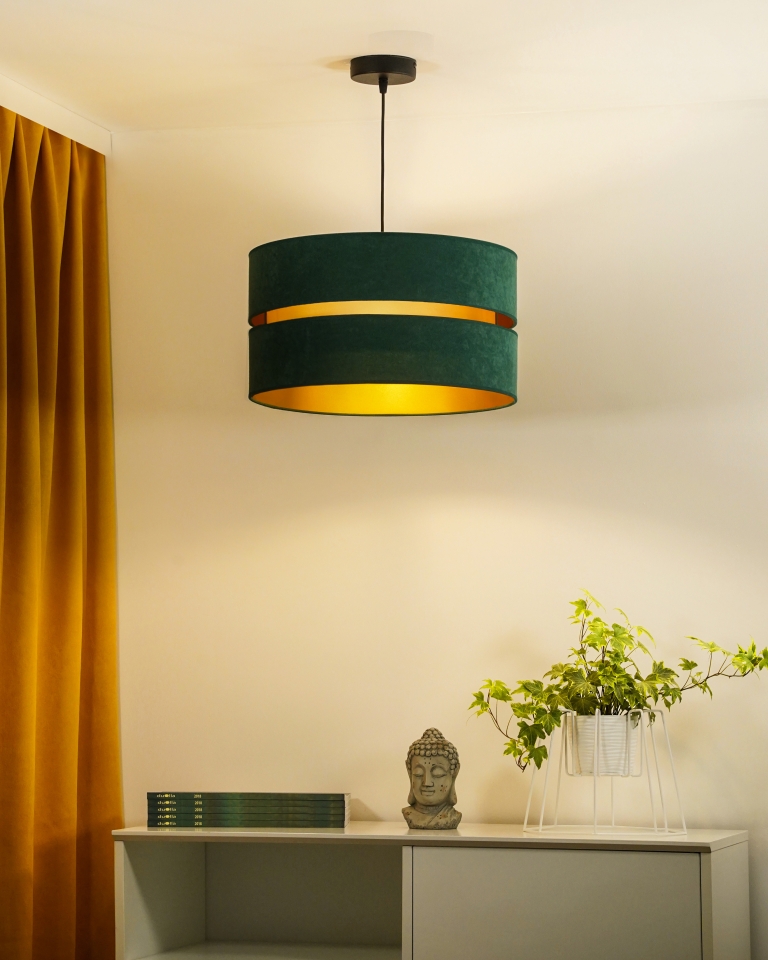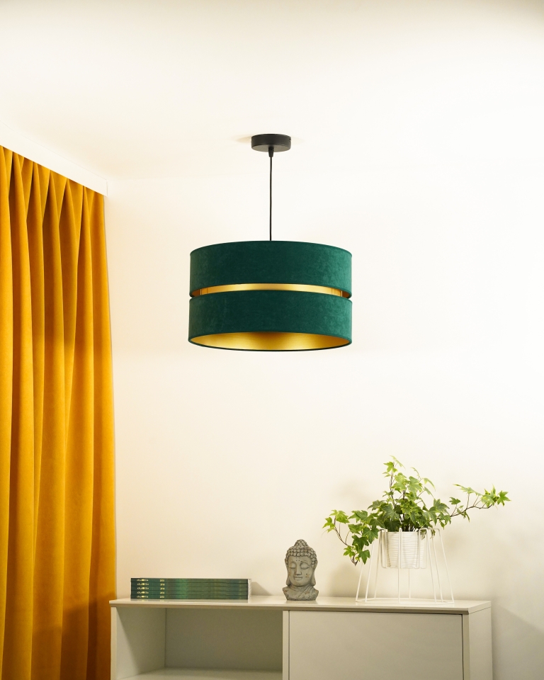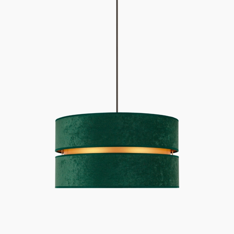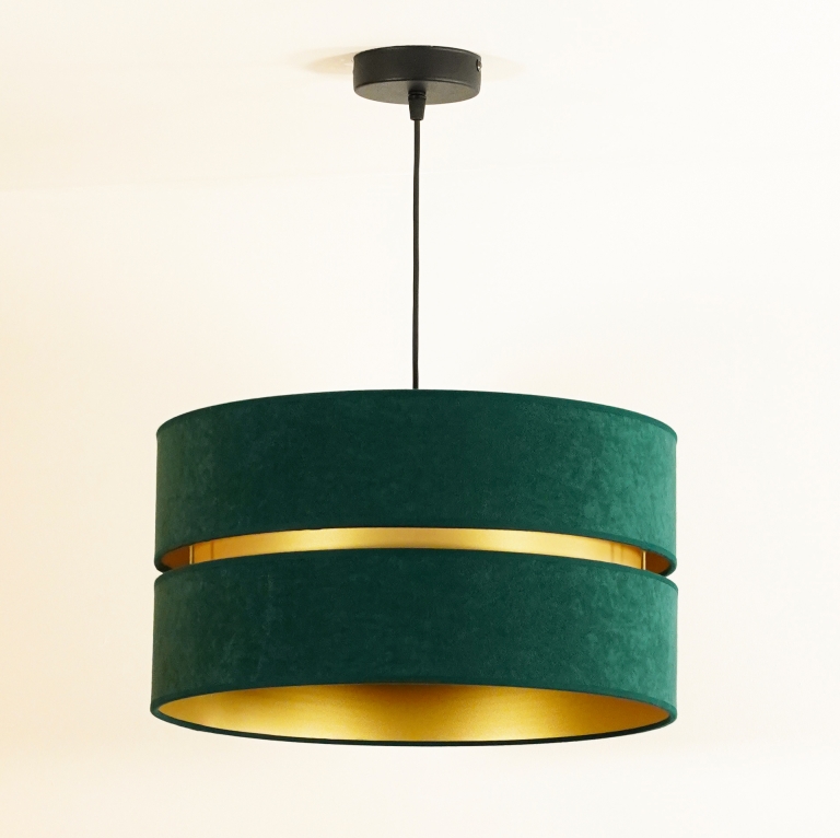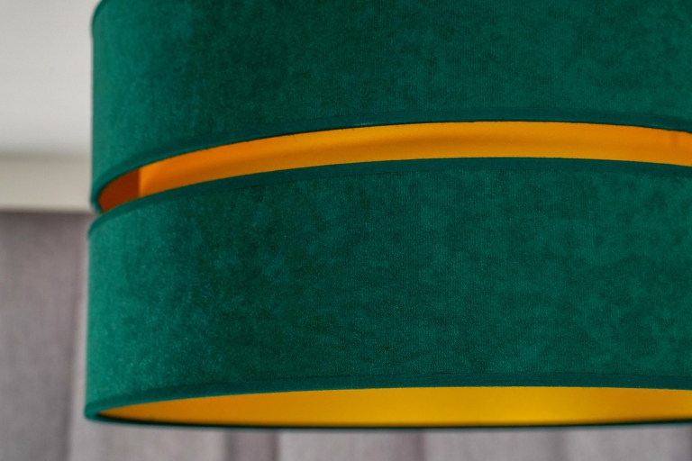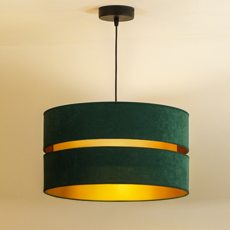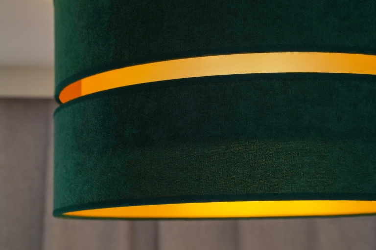 Butelkowa zieleń, która króluje w abażurze tej lampy to absolutny hit. Można ją spotkać coraz częściej w magazynach wnętrzarskich, gdzie jako kolor gra główną rolę w wielu aranżacjach. Jest modna, stylowa i jednocześnie elegancka. Jej prestiż zdecydowanie podkreśla piękne, metaliczne złoto wewnątrz abażuru.