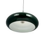 Zielona lampa wisząca Planet w nowoczesnym designie składa się z podsufitki, przewodu oraz nietypowego spłaszczonego klosza wykonanego z metalu i drewna kauczukowego. Całość intryguje, a jednocześnie wyróżnia się ponadczasową elegancją!