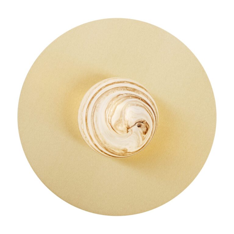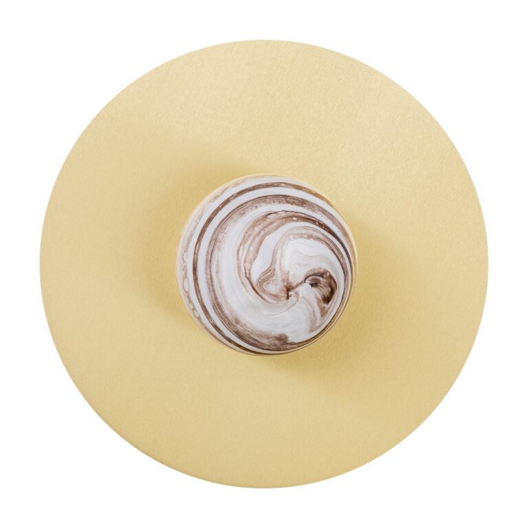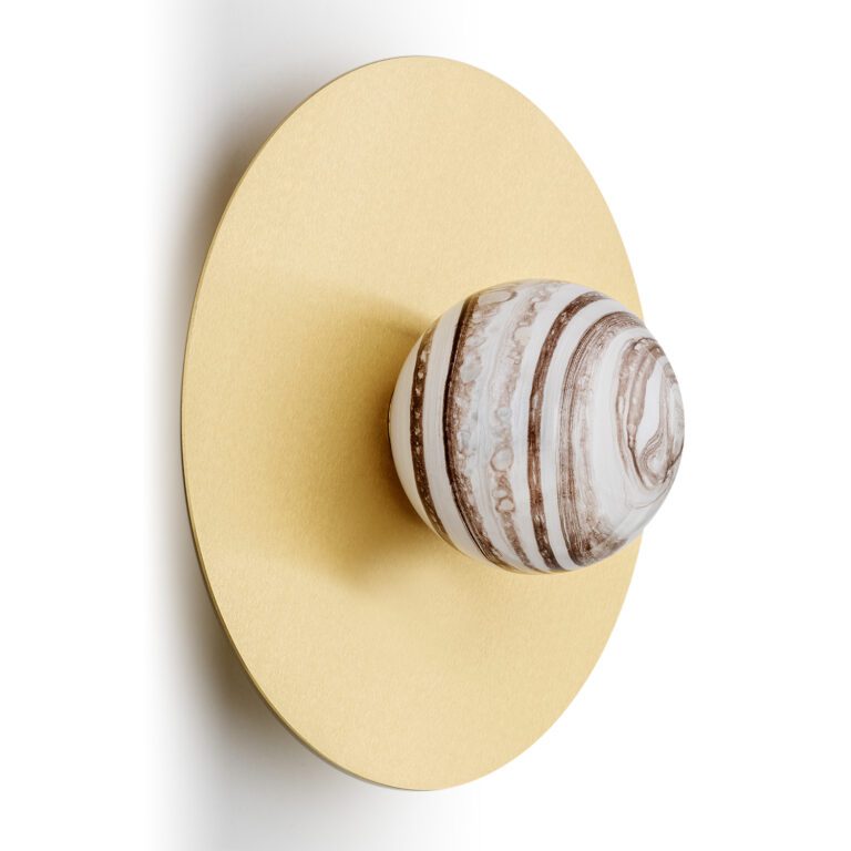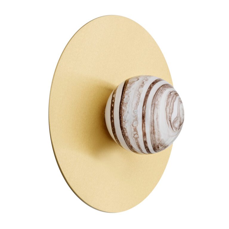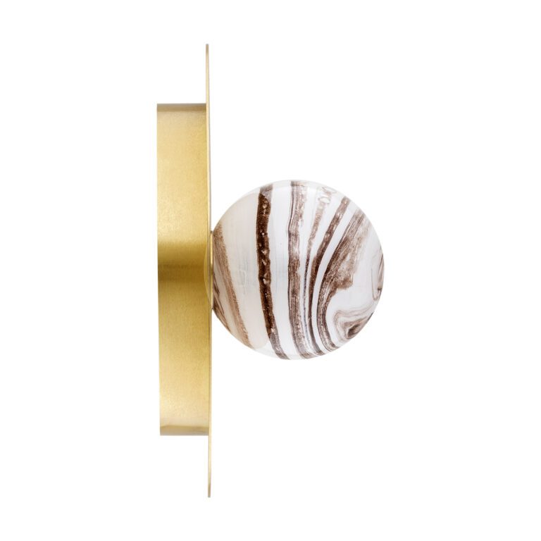 Oferowana lampa w nowoczesnym stylu Piava wyposażona jest w okrągły przyściennik z mosiądzu szczotkowanego oraz kulistego szklanego klosza z dekoracyjnym motywem marmuru, który przywodzi na myśl wygląd planety. Złota lampa ścienna – kula Piava pasuje nie tylko do aranżacji nowoczesnych, ale także do innych wnętrz, którym nadać chcesz elegancji i oryginalności. Możesz ją wykorzystać na przykład jako kinkiet do sypialni w stylu glamour i eklektycznym.