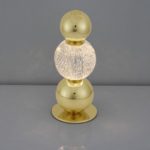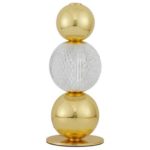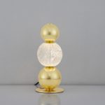 Oferowana przez nasz sklep lampa stołowa glamour Ponce składa się z okrągłej i płaskiej podstawy oraz trzech kul, ustawionych jedna na drugiej. Środkowa z nich pełni funkcję klosza i wykonana została z kryształowego szkła. Światło z niej płynące przepięknie odbija się w dwóch pozostałych (złotych) kulach, jeszcze bardziej dodając całości blasku. Lampa stołowa z kulistym kloszem Ponce wyposażona jest w panel LED, który emituje światło o ciepłej temperaturze barwowej – 3200 LM.