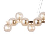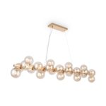 Złota lampa sufitowa Dallas 25 na podłużnej podsufitce wyposażona jest w aż dwadzieścia pięć symetrycznie rozmieszczonych kloszy. Każdy z nich wykonany został z transparentnego szkła i ma modną formę kuli.