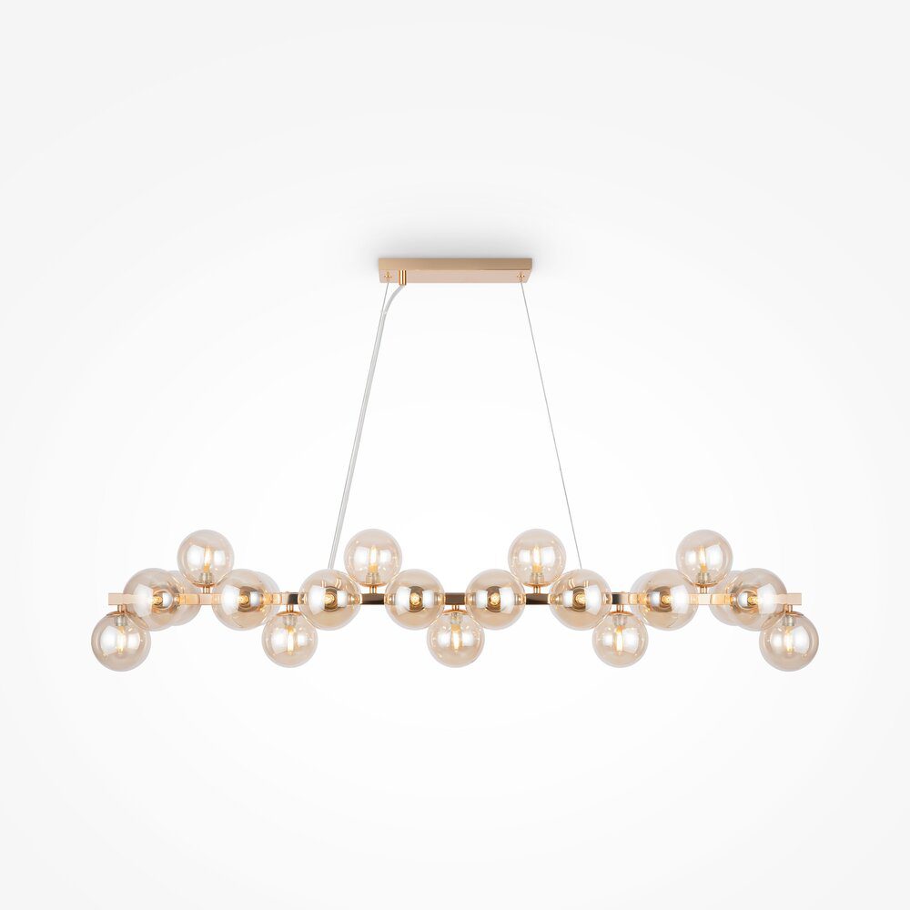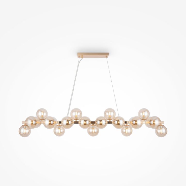 Złota lampa sufitowa Dallas 25 na podłużnej podsufitce wyposażona jest w aż dwadzieścia pięć symetrycznie rozmieszczonych kloszy. Każdy z nich wykonany został z transparentnego szkła i ma modną formę kuli.