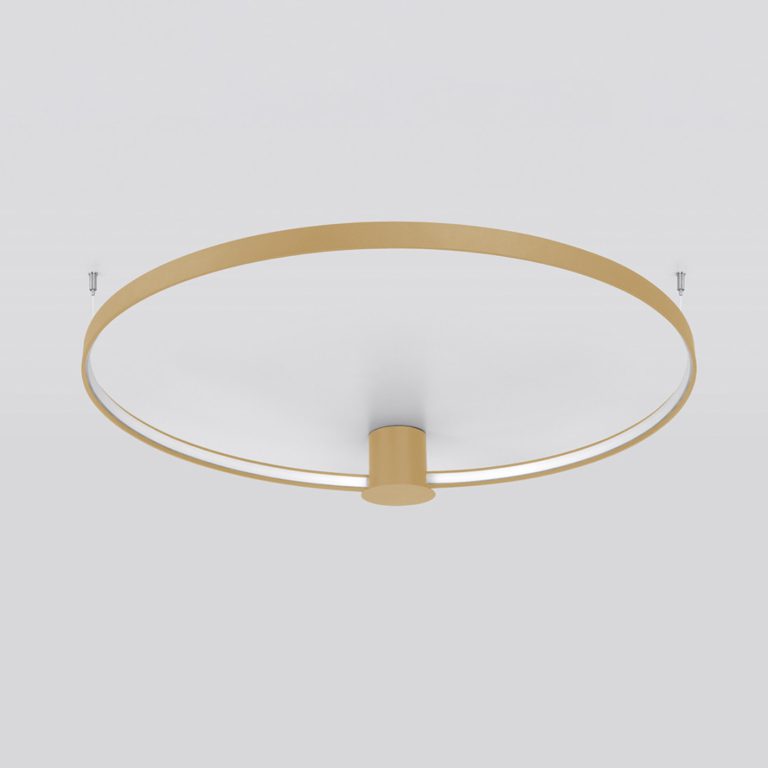Złota lampa sufitowa LED Rio do salonu składa się z podsufitki, zawieszenia oraz designerskiego klosza w kształcie obręczy. W tym nietypowym kloszu znajduje się wbudowane oświetlenie ledowe, które emituje światło o mocy strumienia świetlnego 3870 lm oraz barwie światła na poziomie 3000 K lub 4000 K. Lampa do salonu LED Rio ma średnicę 55 cm oraz wysokość 12,5 cm, dlatego nadaje się zarówno do standardowych wnętrz, jak i pomieszczeń o nieco obniżonym suficie.
