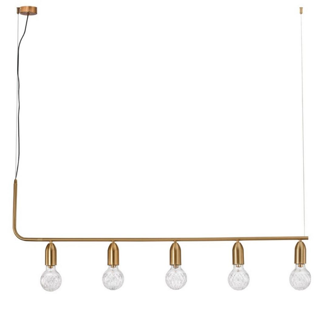 Prezentowana złota lampa wisząca Bani ma pięć punktów świetlnych, które umieszczone są na wygiętym, poziomym stelażu. Nowoczesny żyrandol przymocowany jest do sufitu za pomocą dwóch uchwytów: złotego i transparentnego. Ta prosta, wręcz surowa, kompozycja fantastycznie kontrastuje z eleganckim, złotym kolorem lampy, a także koronkowym zdobieniem szklanych kloszy i plecionym kablem. Uwielbiamy ten kolaż industrialnej stylistyki z artystyczną ekspresją, a Ty?