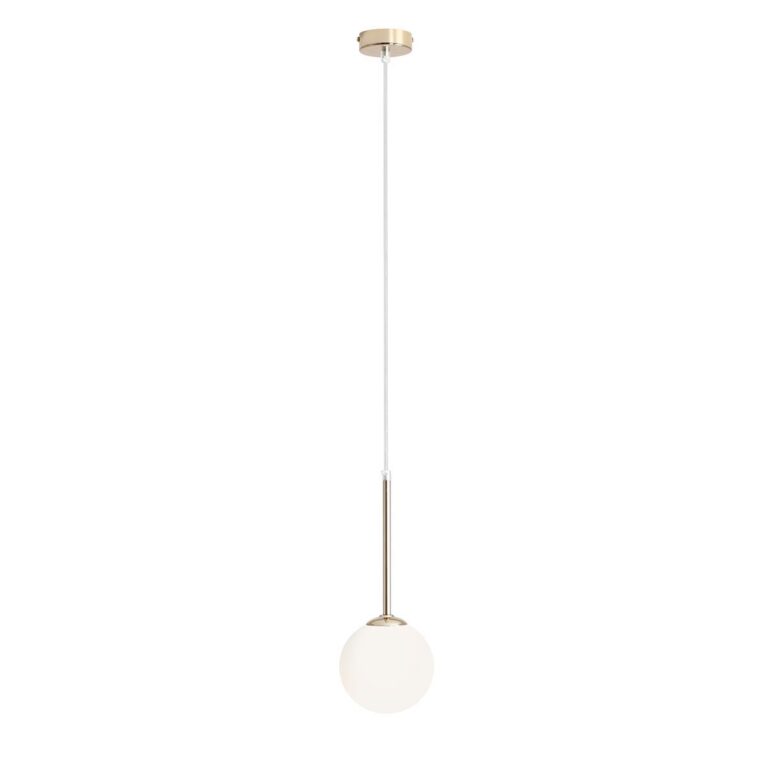 Jednopunktowa lampa sufitowa Bram to absolutna designerska perełka. Niewielki klosz (średnica 14 cm) zawieszony jest na długim i regulowanym uchwycie wykończonym z jednej strony wyrazistą podsufitką, a z drugiej cylindrycznym złotym stelażem. Wyróżnikiem wiszącej lampy z kloszem jest możliwość regulowania wysokości – możesz ją zawiesić nawet ponad metr (dokładnie 120 cm) pod sufitem! Uwielbiamy ten delikatnie przerysowany minimalizm!