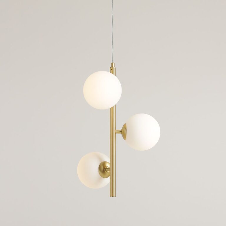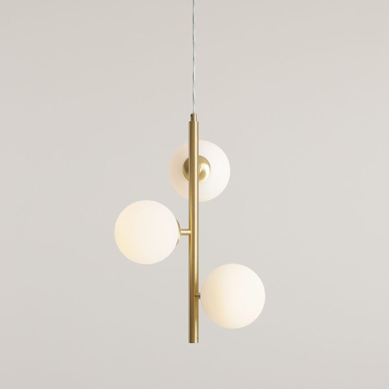 Ta minimalistyczna, ale i efektowna lampa wisząca do kuchni i jadalni doskonale oddaje tendencje współczesnego wnętrzarstwa. Oświetlenie Flott S wyposażone jest w metalowy stelaż w kolorze złotym oraz w trzy mlecznobiałe klosze w kulistym kształcie. Złota lampa wisząca Flott S z białymi kloszami równomiernie rozprasza światło, dzięki czemu może posłużyć nawet jako zamiennik dla żyrandola.