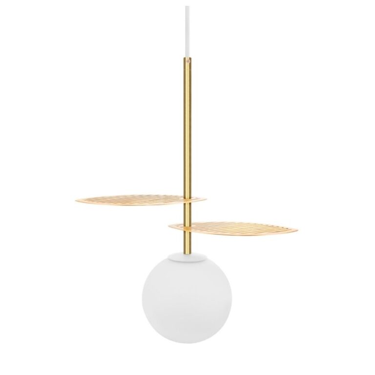 Niewątpliwym wyróżnikiem wiszącej lampy punktowej są dwa złote wachlarze w kształcie łzy lub liścia, które nie tylko są statyczną ozdobą żyrandola, ale też odgrywają ważną i ciekawą rolę podczas włączonego światła. W zależności od natężenia i barwy światła, dodają odrobinę cienia oraz zmiękczenia blasku płynącego z białego klosza. Uwagę zwraca też elegancki złoty pionowy stelaż, na którym umieszczona jest szklana kula.