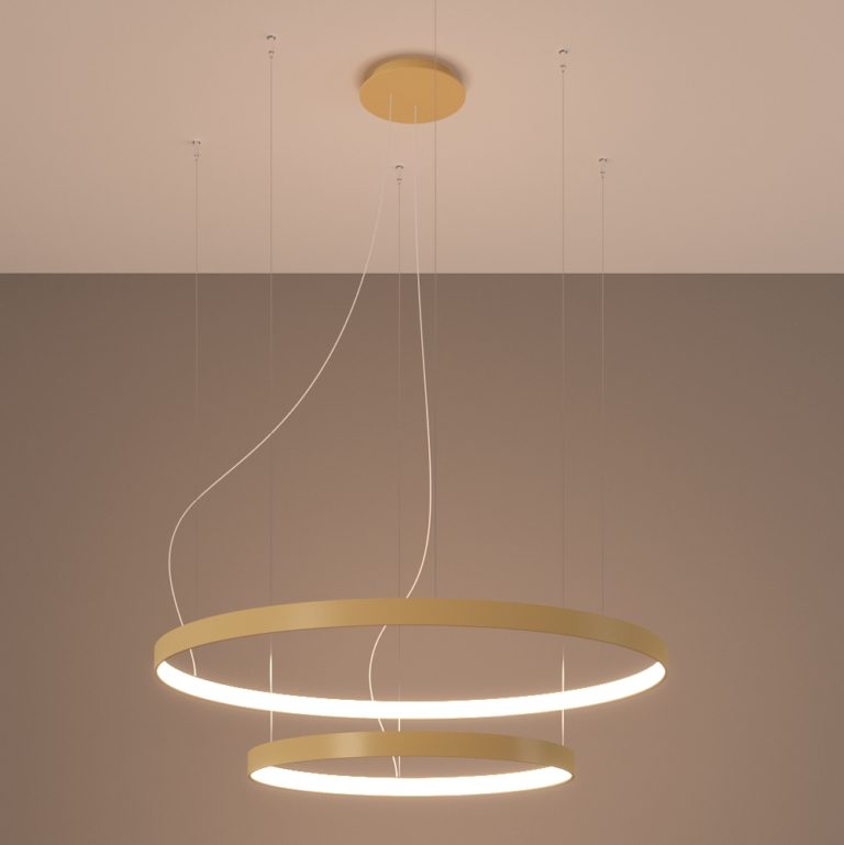 Szukasz eleganckiego oświetlenia do dużego pokoju? W naszej ofercie czeka na Ciebie złota lampa wisząca LED Rio 2, która idealnie sprawdzi się w salonie lub innych przestronnych pomieszczeniach! To zarówno praktyczne źródło światła, jak i designerski element dekoracyjny, która ujmuje swoją minimalistyczną formą i klasyczną kolorystyką.