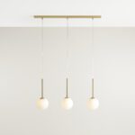 Złota lampa wisząca z białymi kloszami Bolonia 3 w nowoczesnym stylu ma całkowitą szerokość 80 cm oraz regulowaną długość, która sprawia, że całe oświetlenie wyróżnia się również funkcjonalnością. Model wyposażony jest w listwę sufitową, od której poprowadzone są trzy pojedyncze zwisy. Każdy z nich możesz zamontować na tym samym lub innym poziomie. Same klosze mają kształt idealnej kuli – forma ta bardzo dobrze wpisuje się w najnowsze trendy.