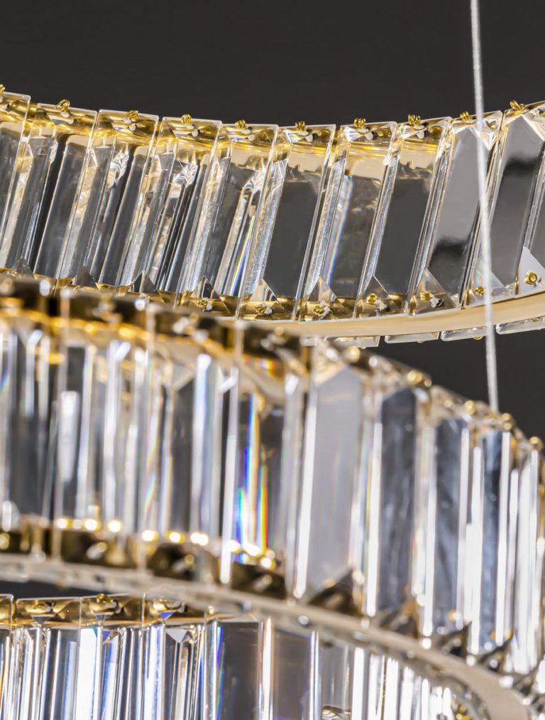 Kompozycję złotego żyrandola Bauta tworzą dwa szklane pierścienie. Średnica pierścienia mniejszego, który znajduje się na dole lampy, wynosi 40 cm, zaś szerokość okręgu większego równa się 60 cm. Za pomocą uchwytów pierścienie przymocowane są do wyrazistej podsufitki, której kolor pięknie współgra ze złotym wykończeniem klosza. Nasz kryształowy żyrandol ma regulowaną wysokość, dzięki czemu możesz powiesić go na dowolnej wysokości, minimalnie 35 cm, a maksymalnie 200 cm. Na załączonym rysunku znajdziesz dokładne wymiary oświetlenia.