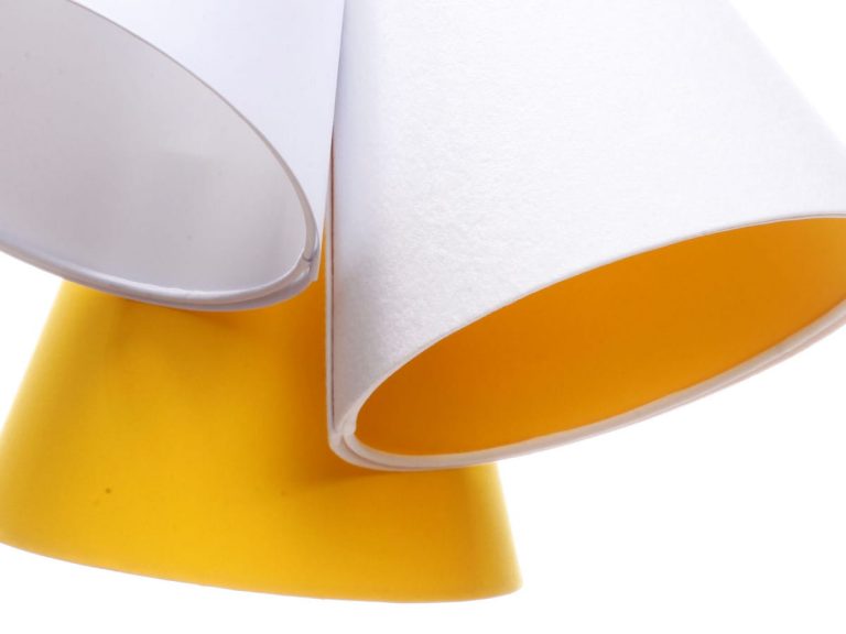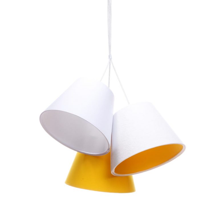 Lampa wisząca Inzo wyposażona jest w aż trzy abażury w stożkowym kształcie. Ich górna średnica wynosi 15 cm, a dolna 25 cm. Natomiast wysokość kloszy to 20 cm. Każdy klosz ma inny kolor, dzięki czemu całość prezentuje się niezwykle efektownie. Jeden abażur jest cały biały, drugi żółty, a trzeci biały z żółtym wnętrzem.