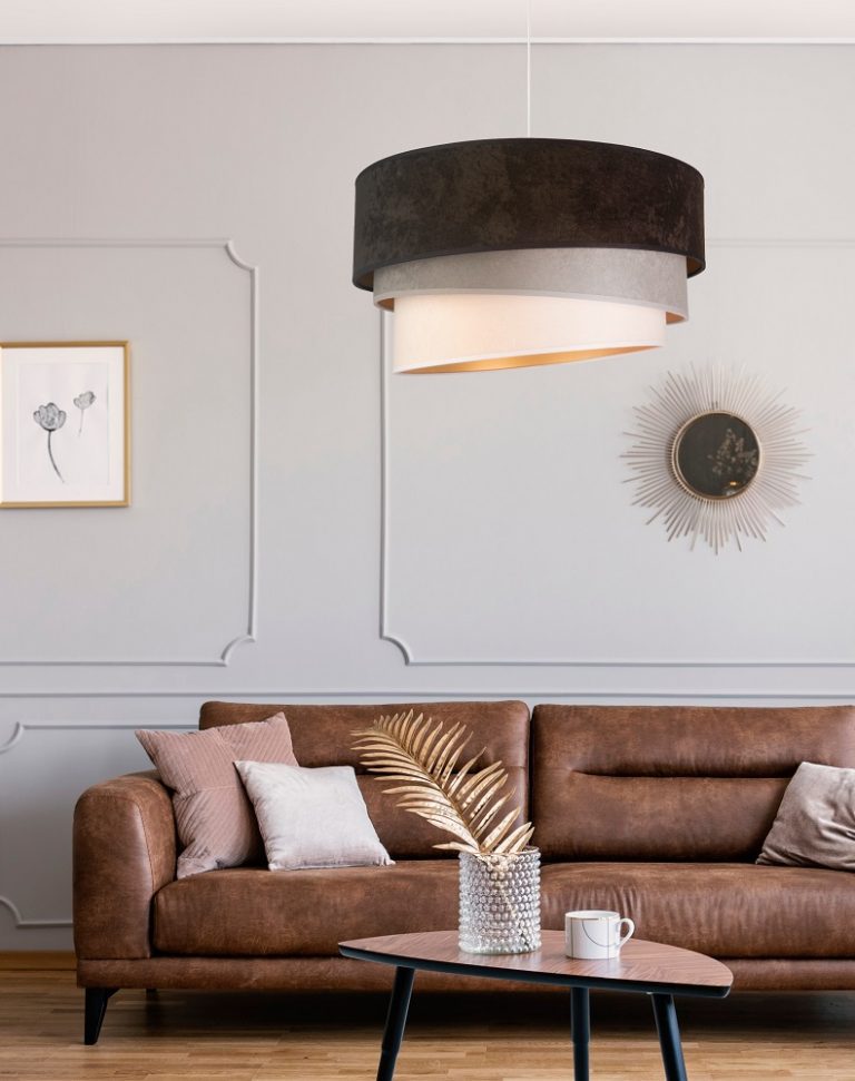 Złoto, choć na pierwszy rzut oka mało widoczne w tym modelu sprawia, że staje się on jeszcze bardziej prestiżowy. Żyrandol Devon wykonany został z najwyższej jakości materiałów — zamszu i złotej folii. Zmieści się on zarówno w wysokich, jak i niskich pomieszczeniach, a to, dlatego że posiada opcję regulacji długości. Devon jest to model, który pięknie dopełni wnętrza jasne i przestronne, a także wpisze się w te mniejsze i ciemniejsze. Możesz być pewien, że lampa ta jest inwestycją na długie lata, nie tylko ze względu na jej kolory, czy geometryczny kształt abażura, ale i jakość wykonania.