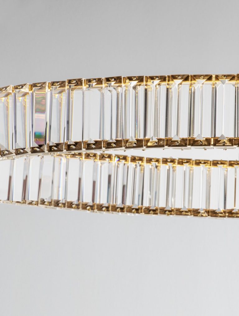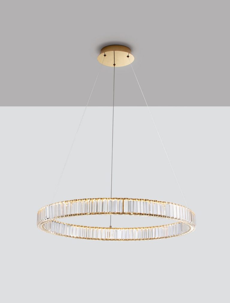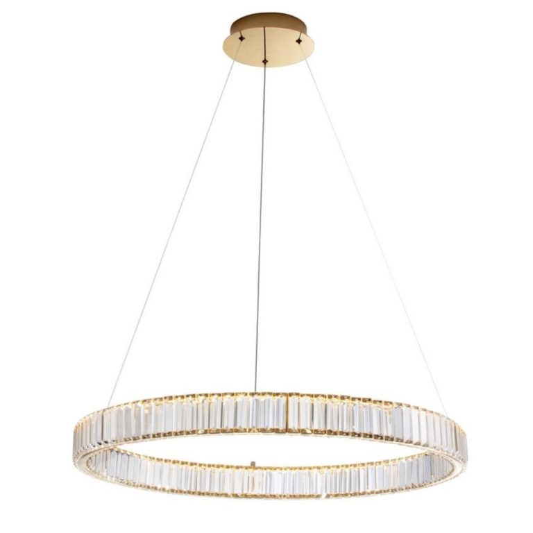 Żyrandol w stylu glamour składa się z pojedynczego okrągłego pierścienia, który wykonano ze szkła i metalu, a także z wyrazistej podsufitki w kolorze złotym. Zwróć uwagę na dekoracyjną strukturę materiału, która fantastycznie współgra ze światłem LED tworząc w pomieszczeniu niezwykłą aurę świetlną i wizualną. Żyrandol w stylu glamour jest szeroki na 80 cm, a regulowana wysokość, na której można go powiesić wynosi od 35 cm do 150 cm. Sprawdź na załączonym szkicu dokładne wymiary oświetlenia, by jeszcze lepiej dopasować go do swojego wnętrza.