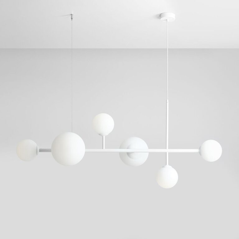 Kolor biały niezwykle często towarzyszy wystrojowi wnętrz, przez co nie traci na popularności. Biel kojarzona jest z czystością, dobrym gustem i elegancją. Żyrandol ze szklanymi kulami Floki jest doskonale skomponowanym oświetleniem do salonu czy jadalni. Jego charakterystyczny design, w połączeniu ze śnieżnobiałym kolorem, współgrają perfekcyjnie.