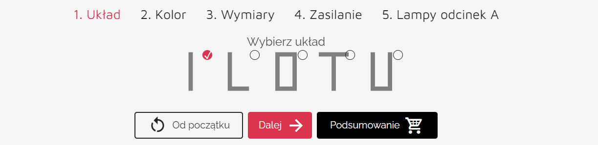 Wybranie miejsca, do którego podpięte będzie zasilenie to kolejna ważna kwestia. Konfigurator umożliwia aż 5 sposobów na podłączenie oświetlenia do energii elektrycznej (A, B, C, D i X). Liczba miejsc do zasilania jest ściśle związana z kształtem układu (patrz: krok 1.).